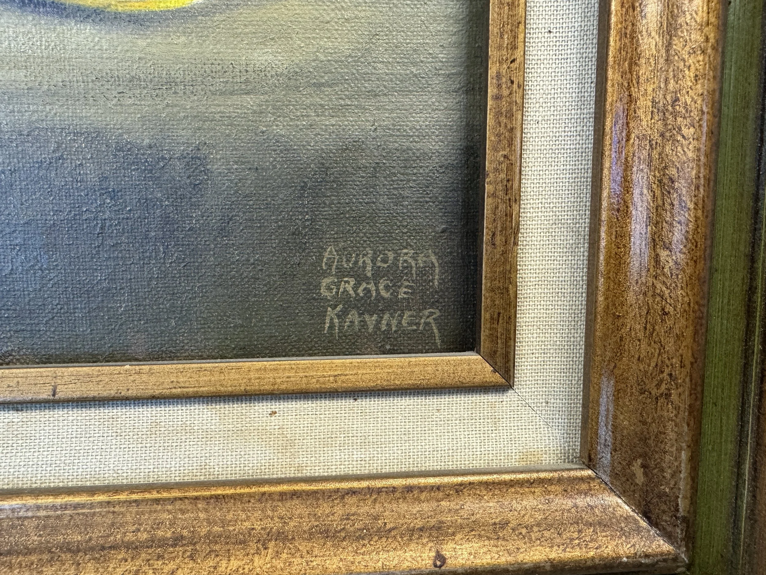 Back / Kavner, Aurora Grace Artist: Kavner, Aurora GraceTitle: UntitledMedium: Oil on CanvasImage Size: 24” x 20”Frame Size: 31” x 27”Signature: Bottom Right SideDescription: Rustic scene of an abundance of fruit in a bowl with winePrice: $350