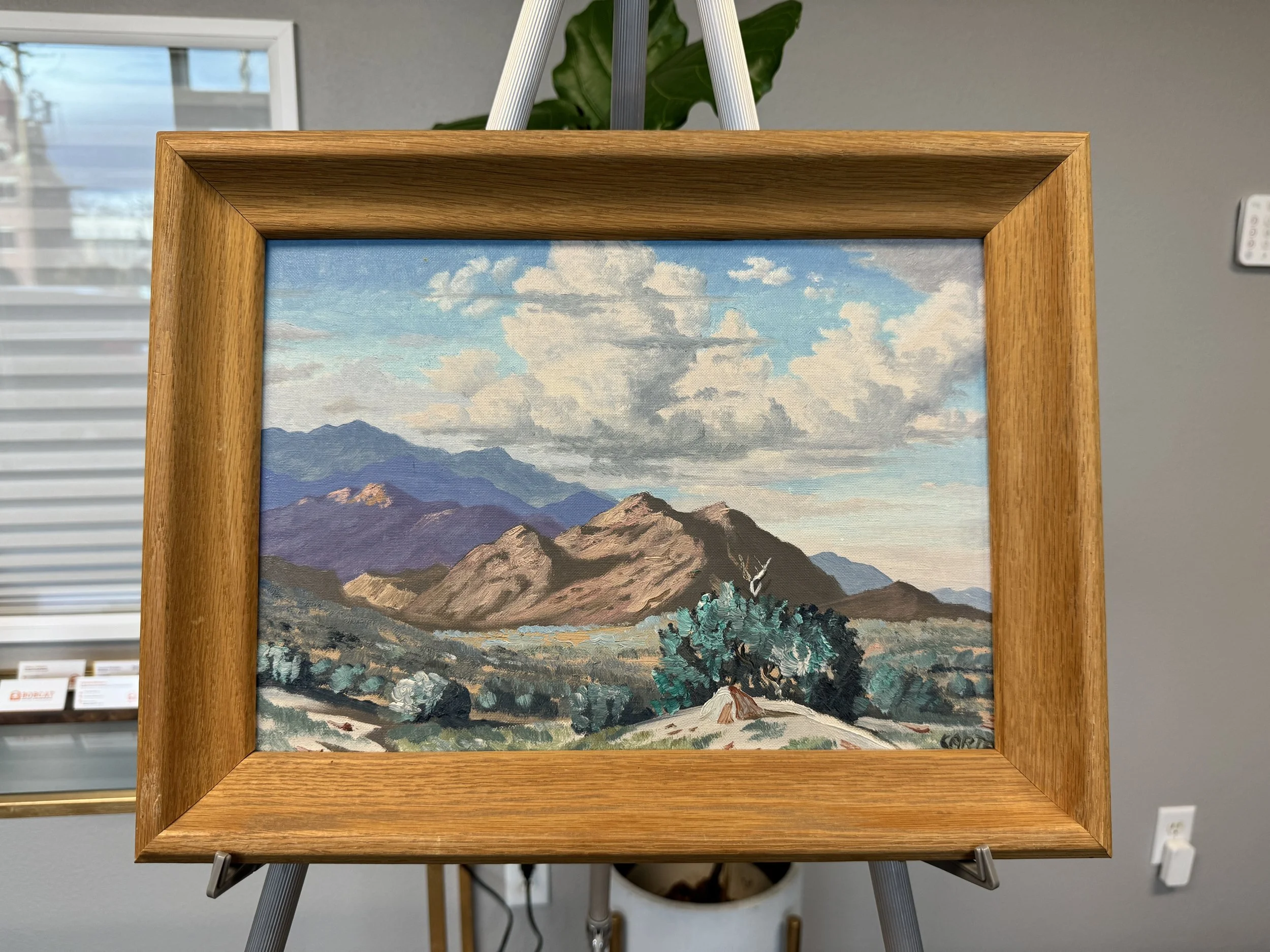 Back / Carter, George Artist: Carter, GeorgeTitle: UntitledMedium: Oil on canvasImage Size: 14” x 10”Frame size: 17” x 13”Signature: Bottom right sideDescription: Nevada landscape distant mountains and cloud coverage in the desertPrice: $830