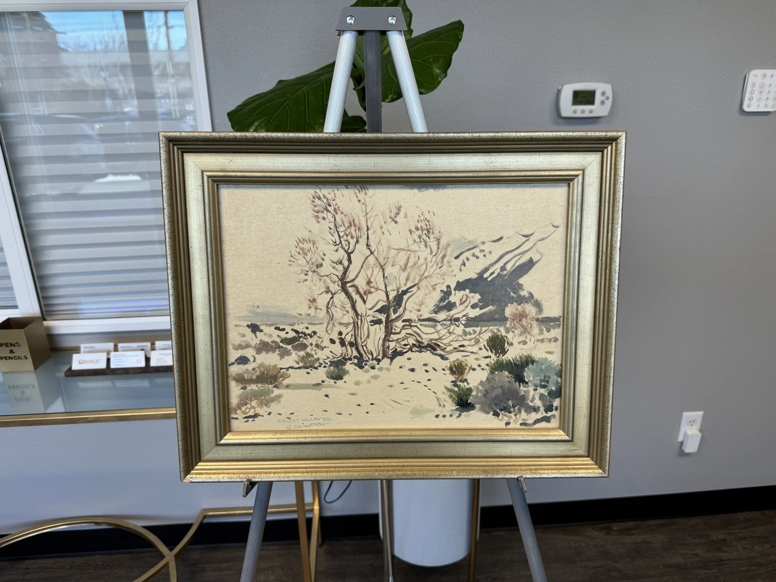 Back / Swinnerton, J. Artist: Swinnerton, J.Title: Desert Willow TreeMedium: Oil on CanvasImage Size: 16” x 12”Frame Size: 20” x 15.5”Signature: Bottom left sideDescription: Desert willow treePrice: $420