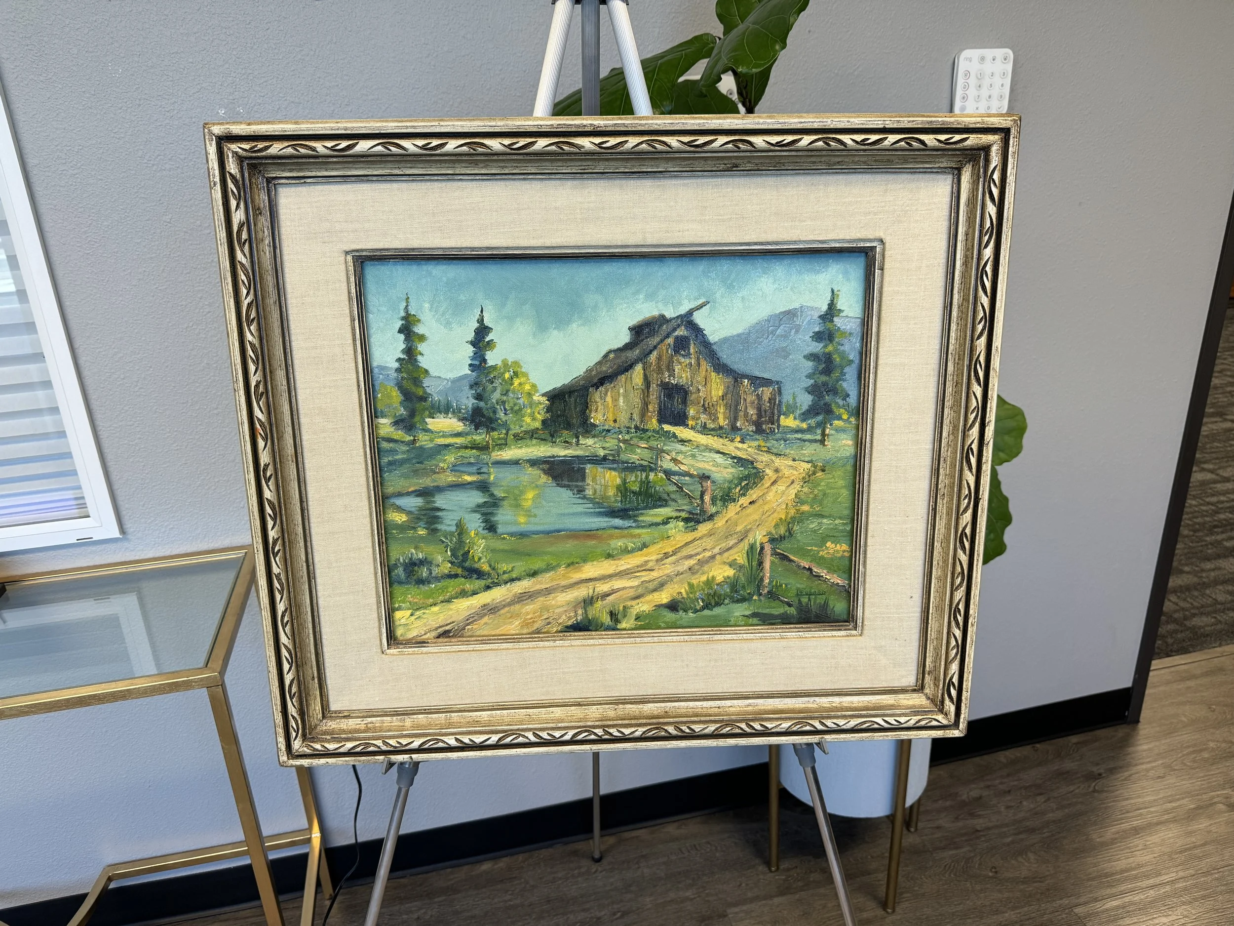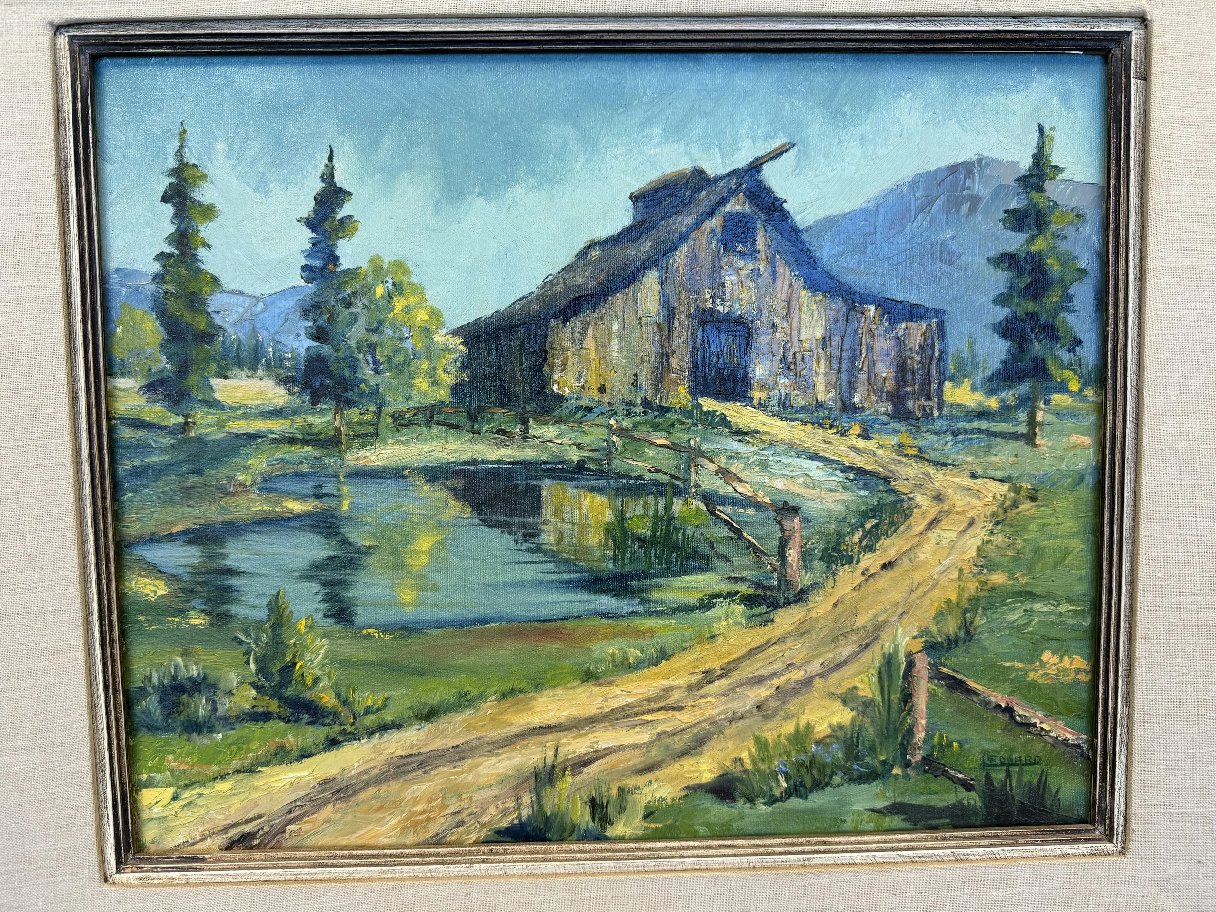 Description: Path to the Barn. This painting depicts a rustic barn nestled in the countryside, with a winding dirt path leading past a tranquil pond surrounded by lush greenery and distant mountains.