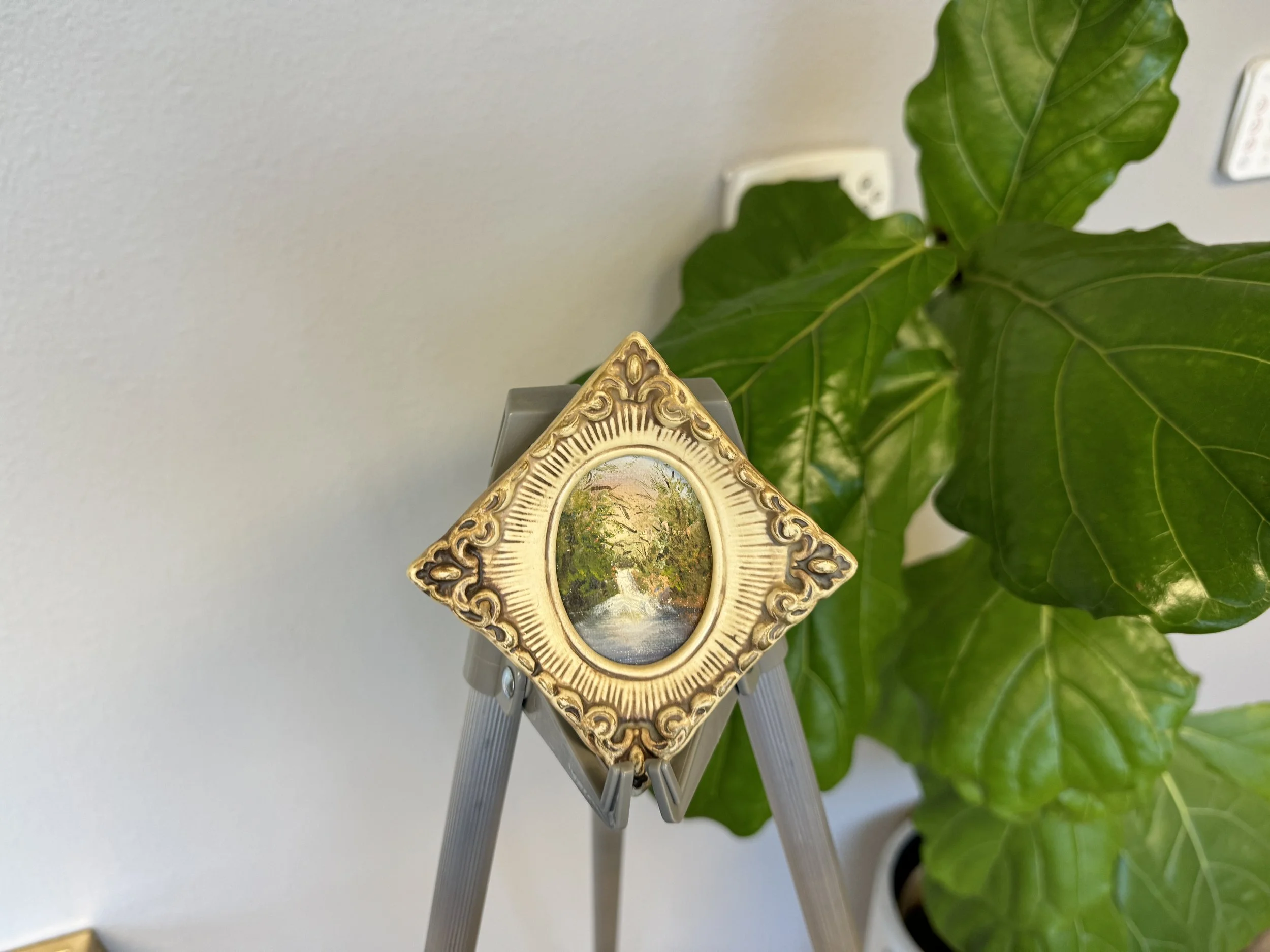Back / Groth, Sally Artist: Groth, SallyTitle: UntitledMedium: Oil on CanvasImage Size: Frame Size: 3.5” x 3.5”Signature: Back of canvasDescription: Cattail-Lined Riverbanks in ceramic frame.Price: $105